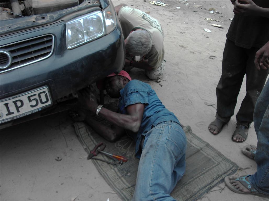 Mit einfachsten Werkzeugen wurde die gesamte Vorderfront demontiert und der Kühler ausgebaut. Nach dem Chaos der herumliegenden Teile hatten wir uns schon von unserem Audi verabschiedet. Aber nach ca. 4,5 h war der geklebte Kühler wieder eingebaut, alle Teile am rechten Fleck und der Wagen schnurrte wieder, als ob nie etwas gewesen wäre. Wir haben grosse Hochachtung vor den goldenen Händen dieser "Fachleute". Der ganze Spass hat uns traumhafte 45€ gekostet. ( Danke an den "Reparaturmeister" Malick Sene ! )